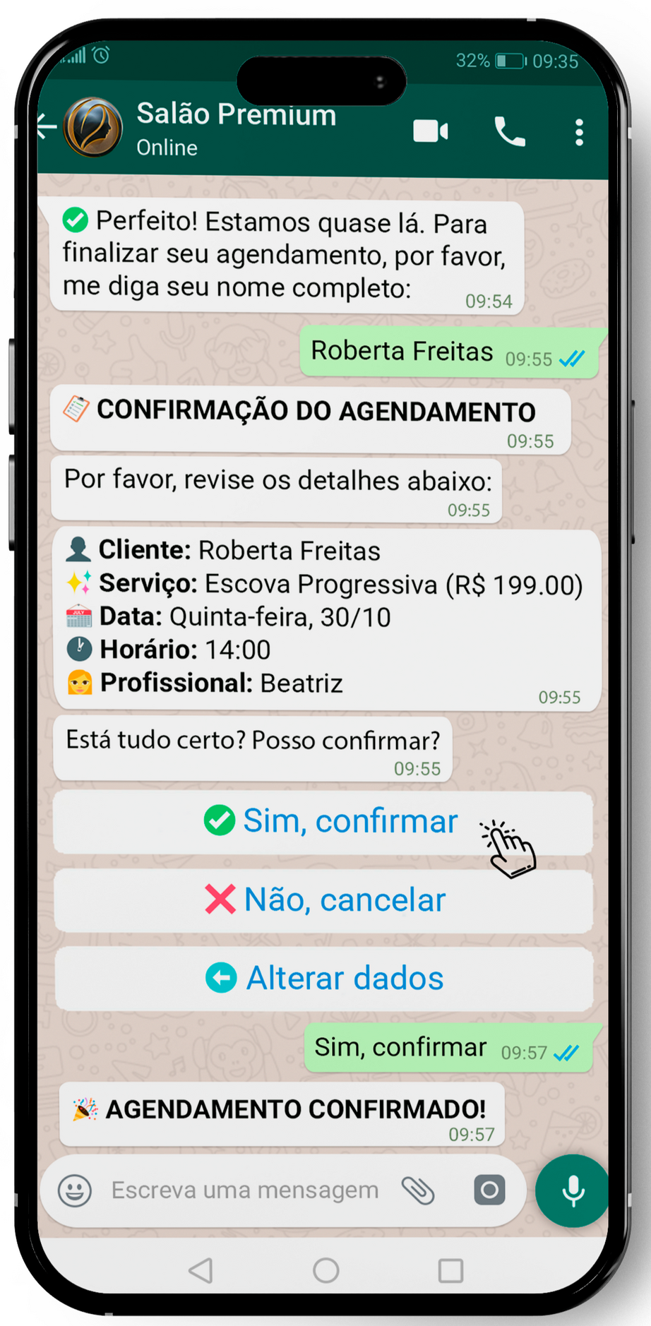 ✅ Resultado: Cliente agendado e confirmado sozinho. Você não precisou parar o serviço para responder.